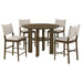 This counter-height dining set blends transitional style with practical design, creating a warm and inviting space for casual dining. The set includes a round counter-height table with a rich brown finish, angular legs, and an open lower shelf for added functionality. Complementing the table are matching counter-height chairs upholstered in light tan fabric with foam-padded seats. Each chair features a wrapped backrest with unique brown tie accents for a sophisticated touch. Crafted from durable Asian hardwood, engineered wood, and fabric, this set is perfect for everyday dining or entertaining.